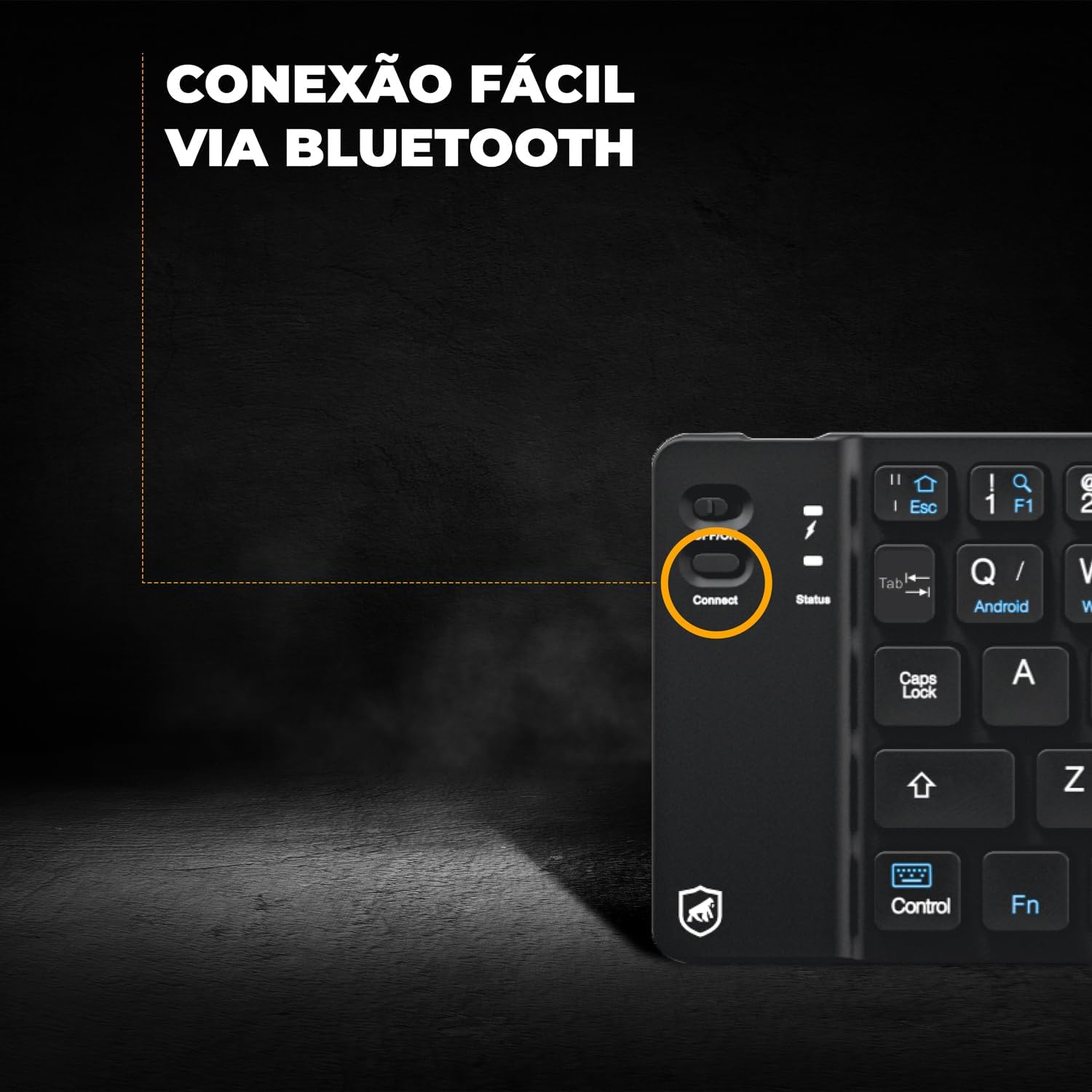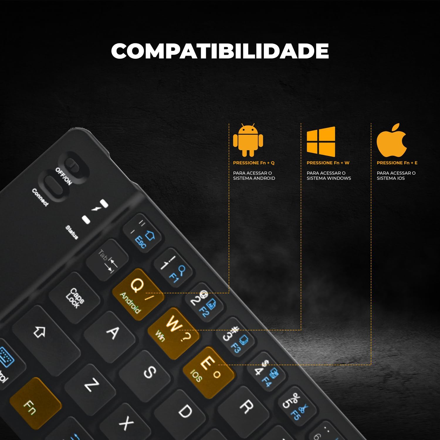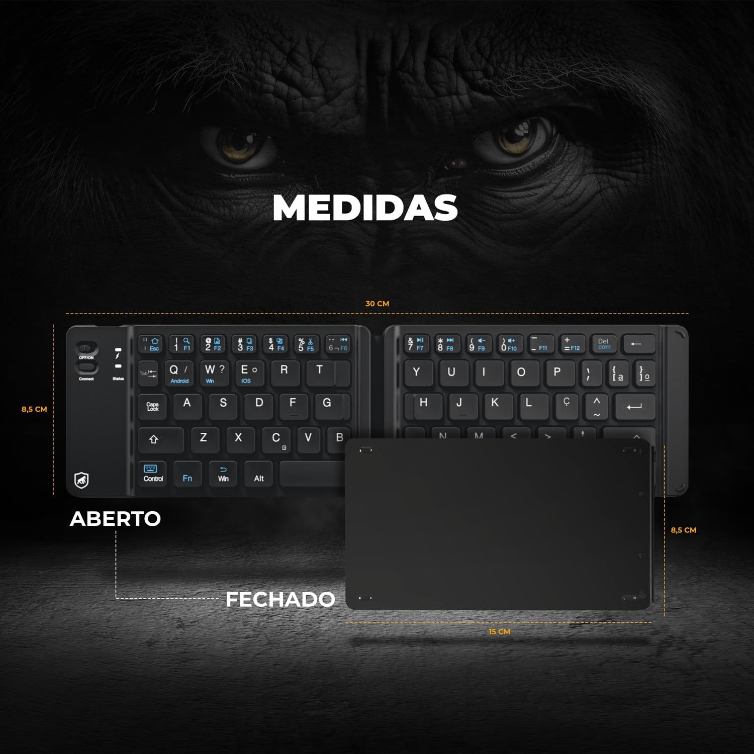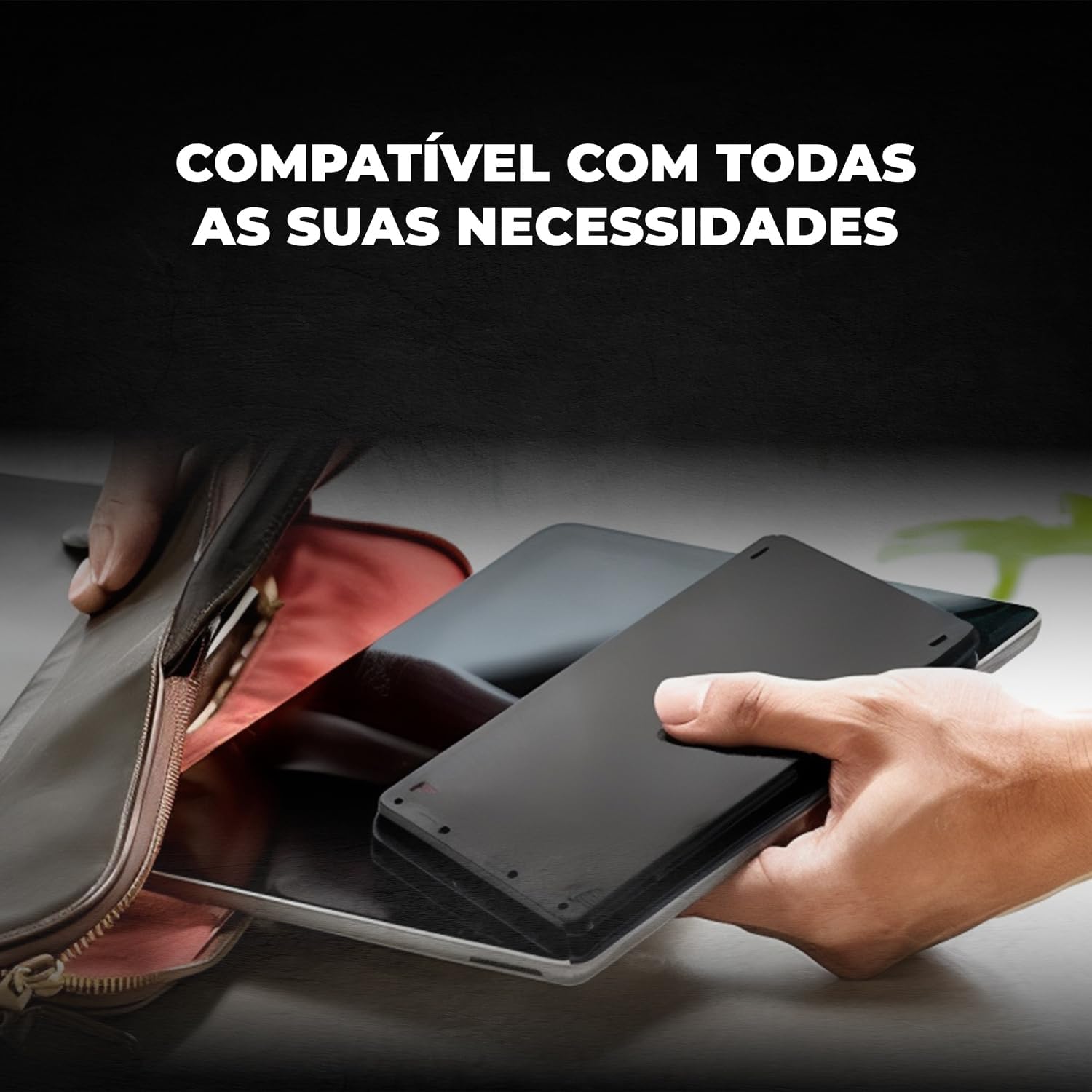 Com dimensões de apenas 15×8,5 cm quando fechado, o teclado cabe facilmente em bolsas, mochilas ou até no bolso, oferecendo mobilidade total para quem precisa digitar com praticidade em qualquer lugar.
