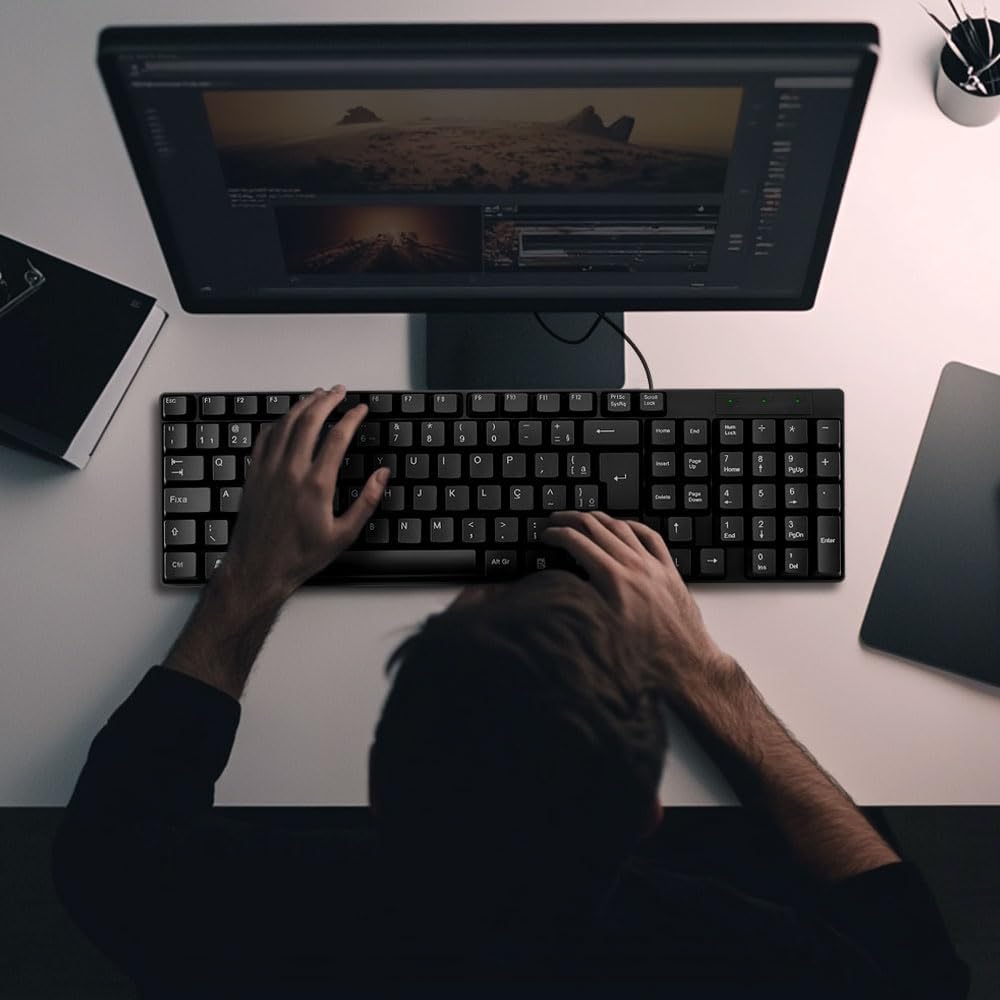 Perfeito para o dia a dia: Um teclado prático e funcional, que atende tanto às necessidades básicas quanto às exigências de durabilidade e conforto.