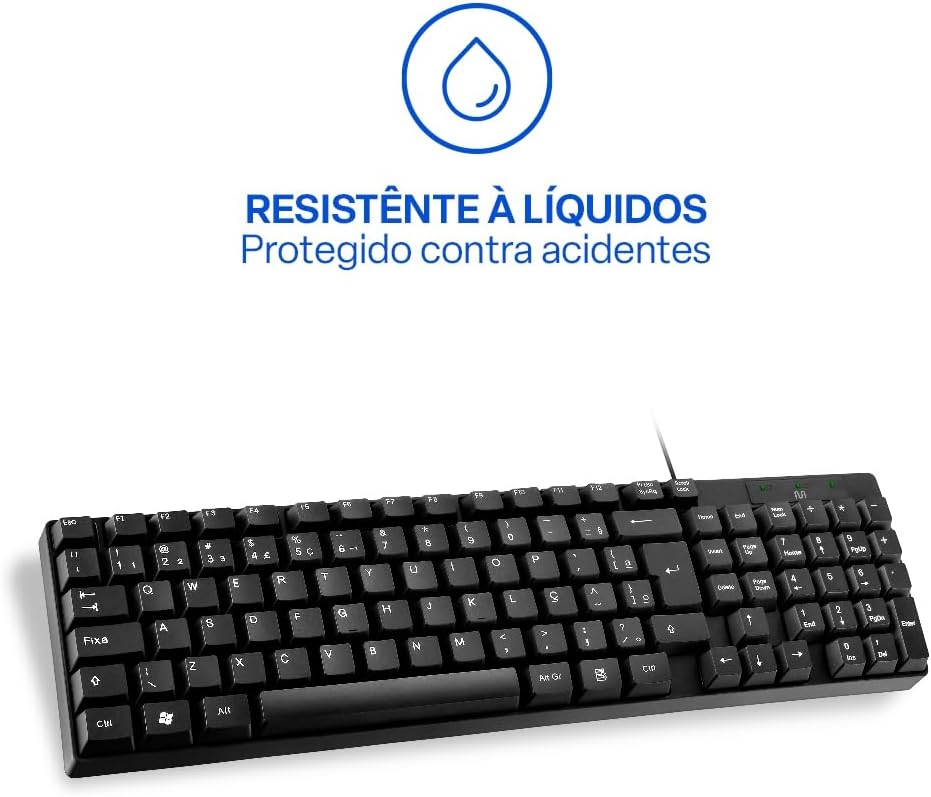 O teclado é resistente a respingos de líquidos, garantindo mais tranquilidade durante o uso diário, mesmo com eventuais imprevistos.