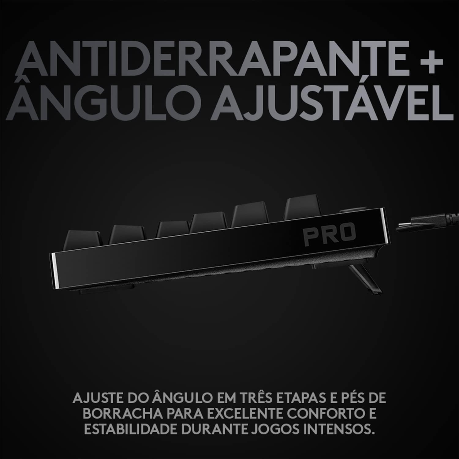 Construído com e para atletas de eSports para oferecer desempenho, velocidade e precisão em nível de competição, o Teclado Mecânico para Jogos Logitech G® PRO vem em um design compacto e sem teclado numérico que libera espaço de mesa para mouse de baixa sensibilidade. switches GX Blue Clicky de nível profissional – Switches GX Blue Clicky proporcionam um clique audível e um feedback táctil para uma pressão de tecla sólida e segura. O LIGHTSYNC RGB e a memória integrada programável permitem personalizar e armazenar um padrão de iluminação para torneios.* Inclui um ajuste de ângulo de três etapas para níveis adicionais de conforto, além de pés de borracha para excelente estabilidade durante jogos intensos. Um cabo destacável facilita o transporte. Jogue para vencer. *Programação de iluminação RGB requer o software Logitech G HUB.